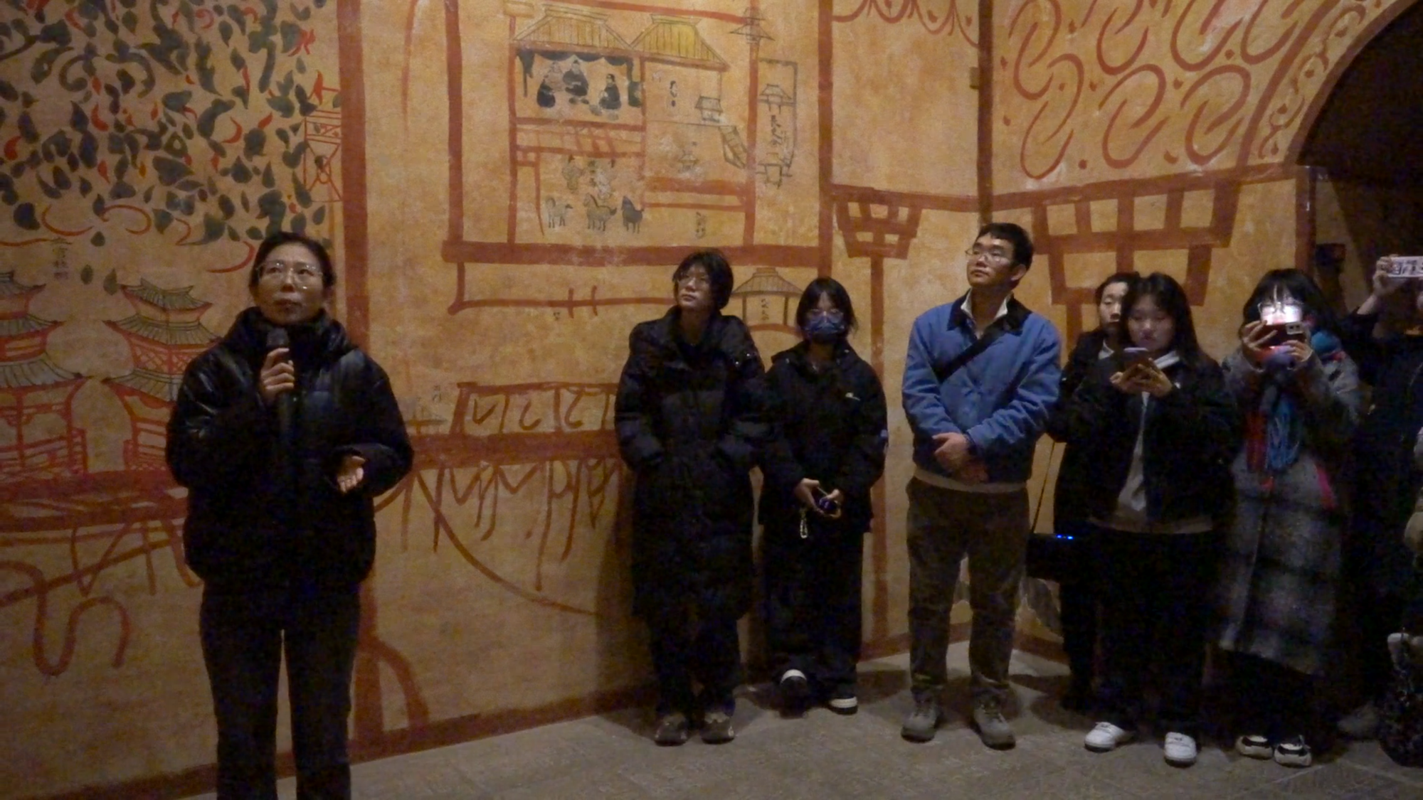 观看和林格尔东汉壁画墓复制壁画。