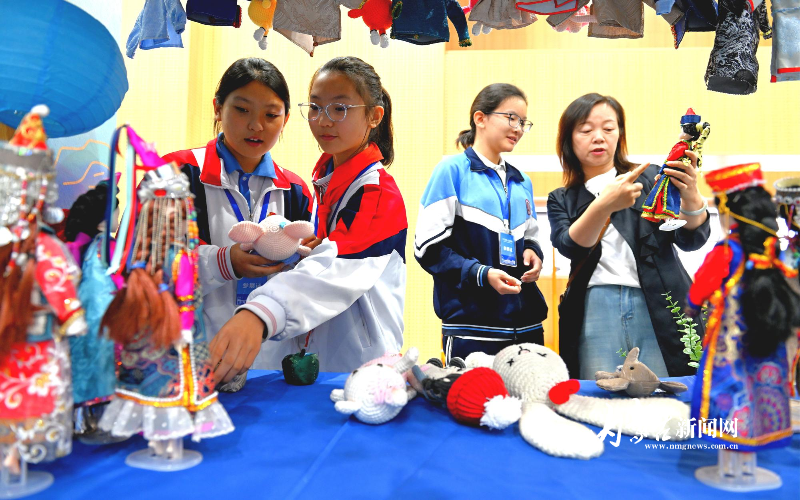 呼和浩特市第四十三中学学生为参观者介绍手工作品