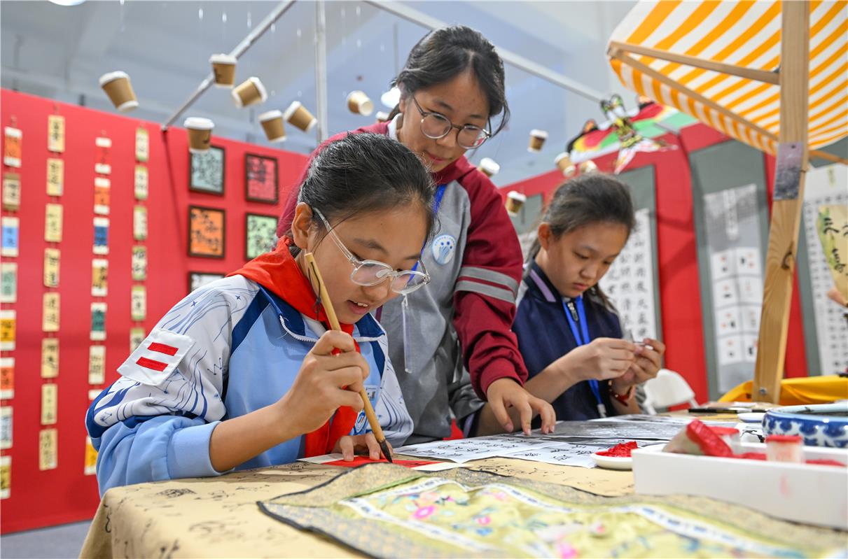 学生们在呼和浩特市第二中学初中部展位体验书法。