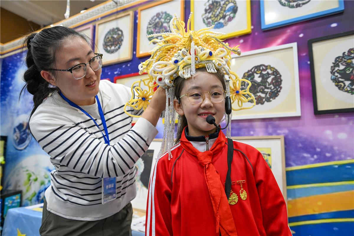 呼和浩特市赛罕区银河小学师生展示手工制品。