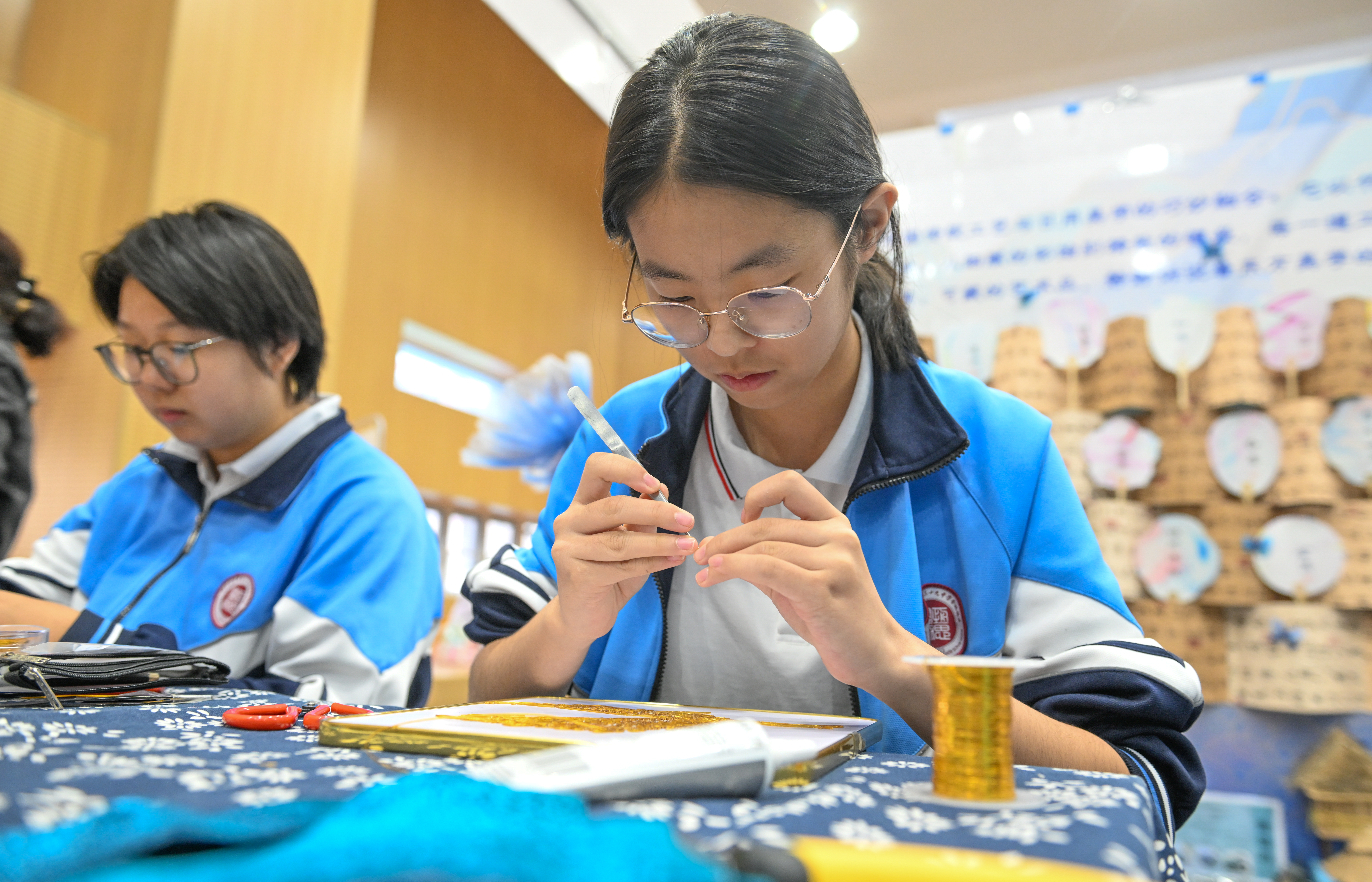 呼和浩特市第四十三中学学生制作掐丝珐琅。