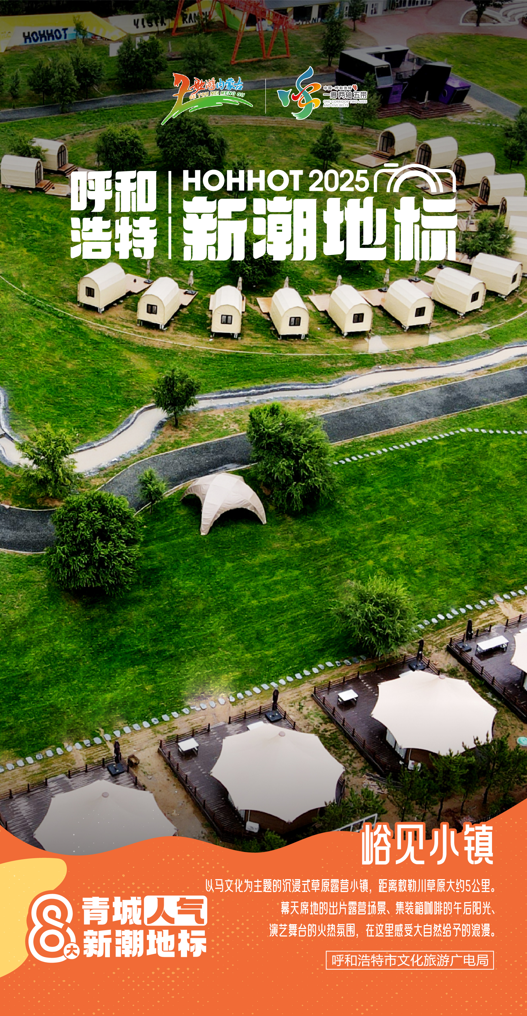 它们分别是青城公交社(复古车厢与城市记忆交融的打卡圣地)、敖包相会公园(草原上的浪漫爱情地标)、内蒙古航天科教研学中心(沉浸式外太空体验基地)、峪见小镇(马文化主题草原露营小镇)、牛街(百年老街焕新,传统与潮流碰撞的烟火街区)、敕勒川星光里·影视戏剧幻城(一站式草原文化体验空间)、玉带岛公园(城市湿地中的生态绿洲)、礼盒公园(“全球购”概念口袋公园)。