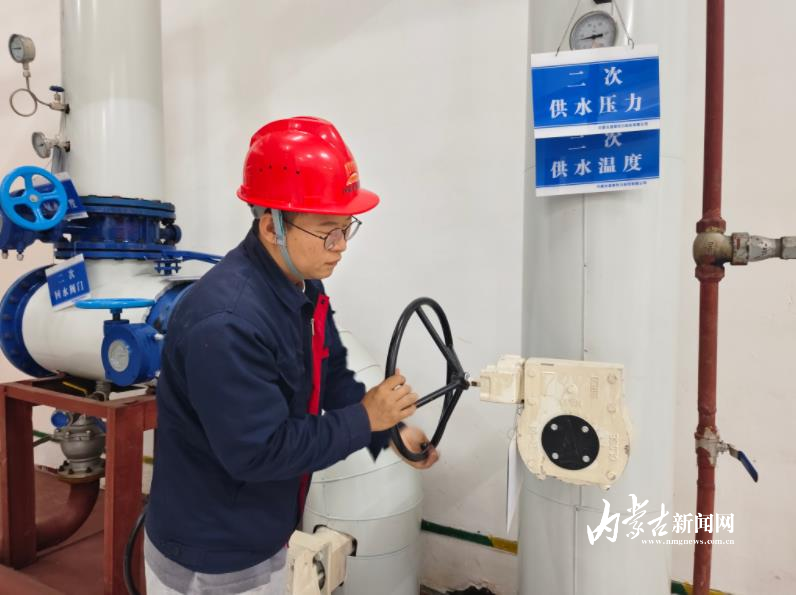 9月22日,记者在内蒙古晟泰热力股份有限公司恒大绿洲换热站看到,工作人员打开阀门进行二次管网注水,同时观看压力表是否达到运行参数。