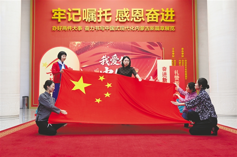 9月28日,内蒙古展览馆工作人员沉浸式表演《绣红旗》。当日,内蒙古展览馆开展了“礼赞七十六载·共庆家国团圆”国庆主题系列活动。活动通过升国旗仪式、沉浸式演出、主题打卡、红歌快闪等多元形式,营造了热烈喜庆的节日氛围,吸引了众多市民参与。草原云·内蒙古新闻网记者 白雪 摄