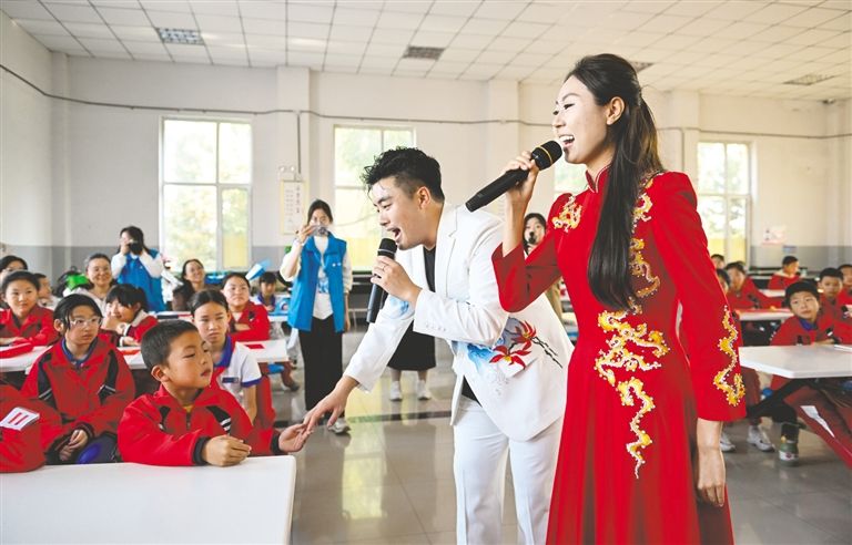 9月29日,内蒙古艺术学院乌兰牧骑红色精神宣讲团成员在演唱《挂红灯》。当日,内蒙古艺术学院乌兰牧骑红色精神宣讲团走进呼和浩特市土默特左旗台阁牧镇栽生小学,开展“两弹一星”精神主题宣讲与惠民展演,为栽生小学的师生带来了一场别开生面的爱国主义与科学精神教育课。草原云·内蒙古新闻网记者 王磊 摄