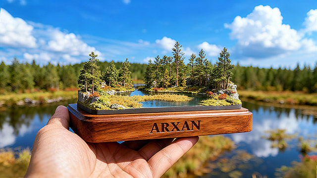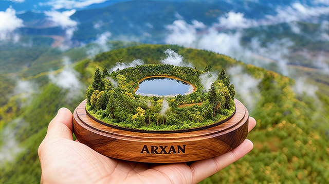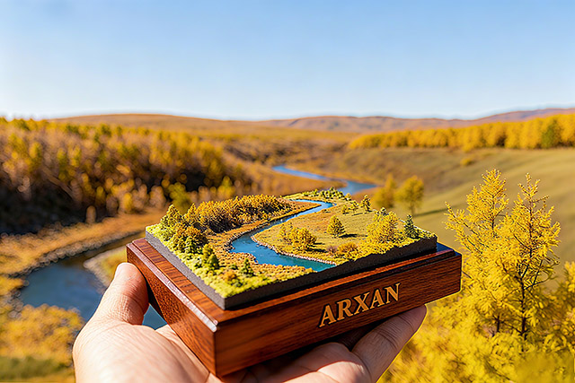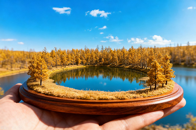 木匣中凝固的微缩景观,藏着阿尔山石塘林的神奇密码。黑色玄武岩如凝固的浪涛,托起翡翠色的湖泊与云杉林,苔藓在石缝间织就绿毯,恰似大地为火山遗迹披上的盛装。熔岩流冷却后形成的“喷气锥”“熔岩隧道”,被兴安落叶松、偃松以顽强根系缠绕。林间大小不一的湖泊,倒映着蓝天与火山岩的刚毅轮廓。这里每一块岩石都带着火焰的记忆,每一棵树都在演绎生命对绝境的征服。
