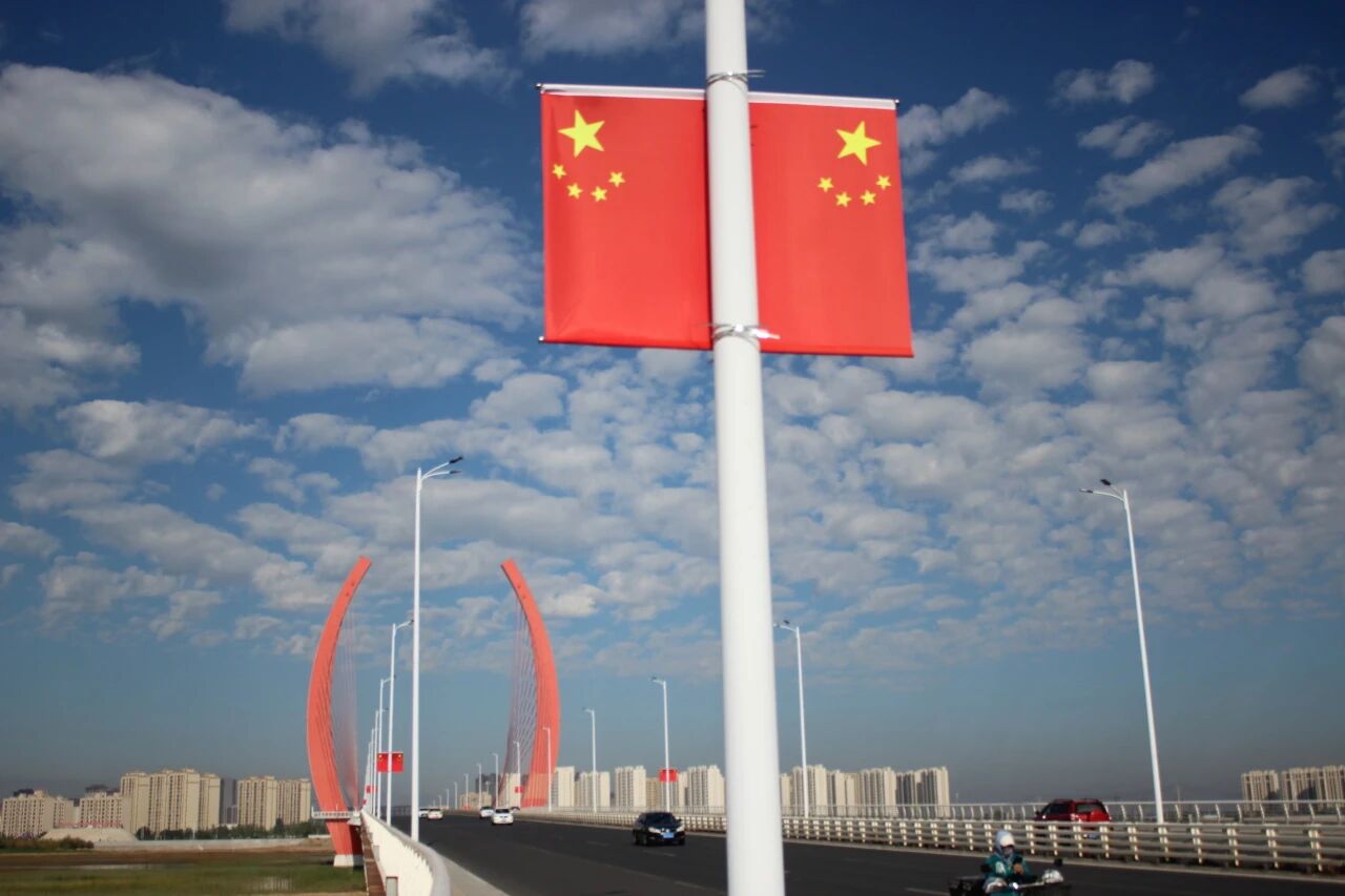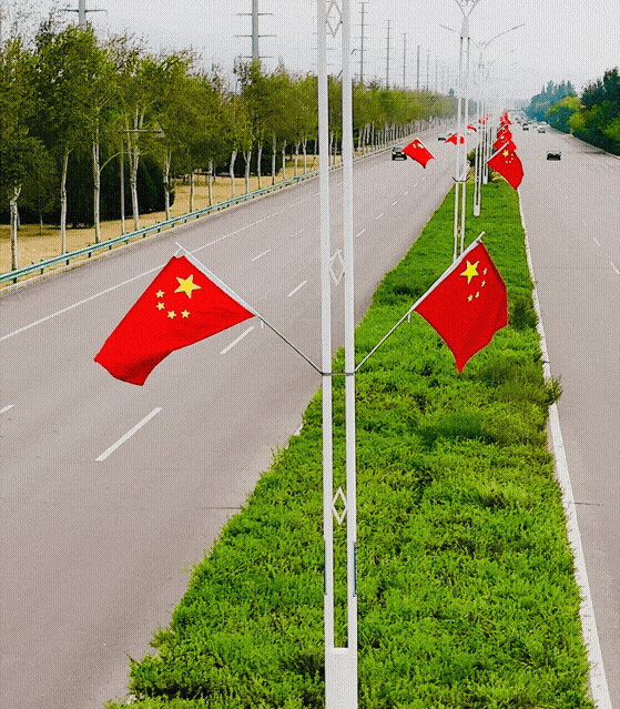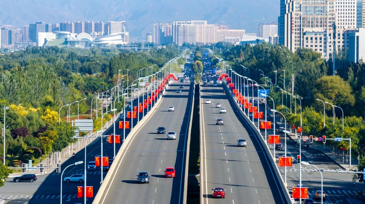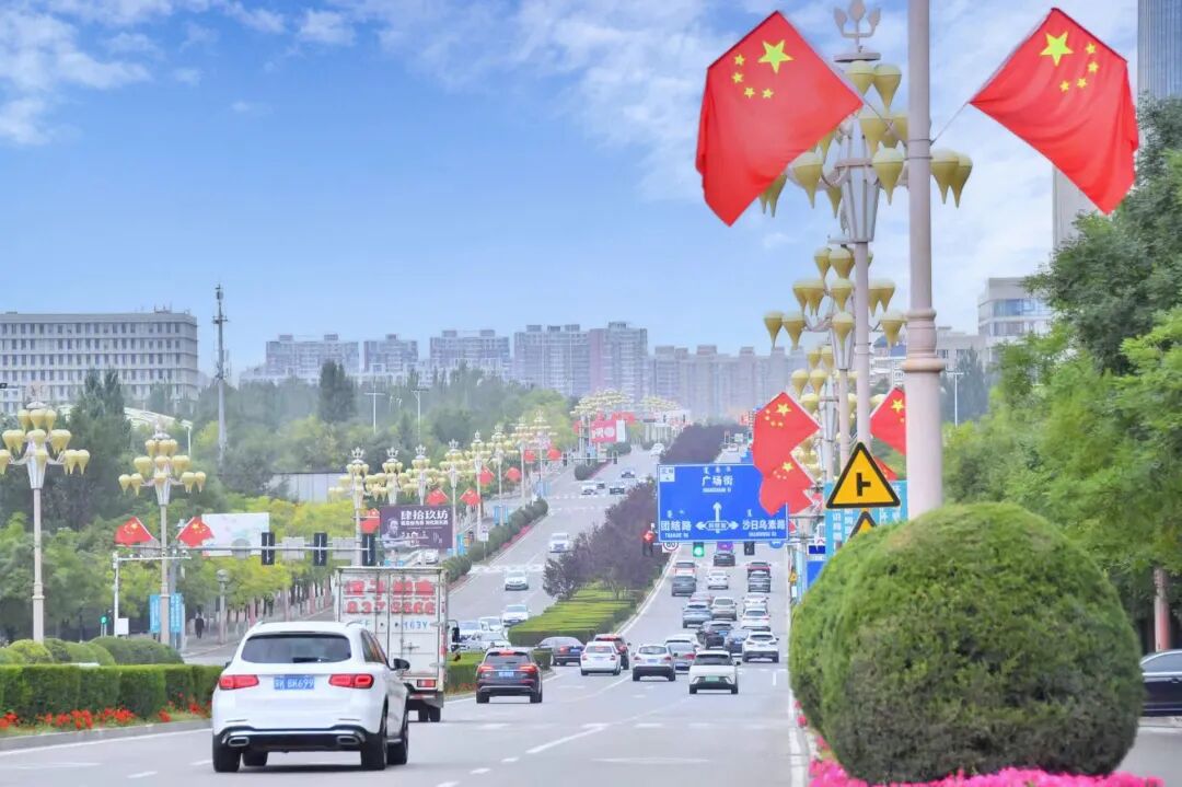 呼和浩特市丝绸之路大道两侧悬挂的国旗。