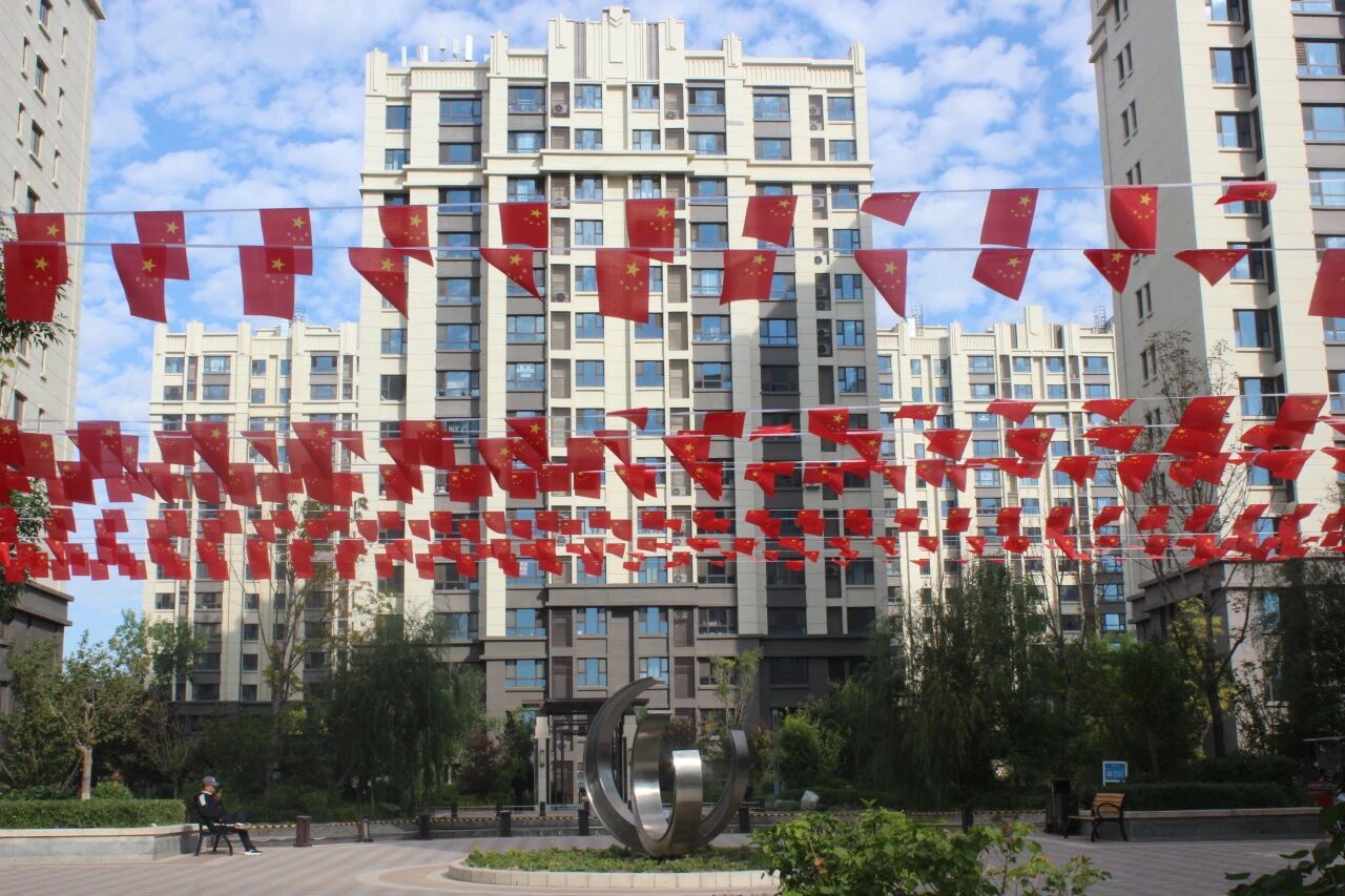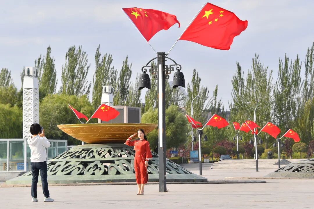 额济纳旗达来呼布镇主要街道两侧,五星红旗随风舒展。