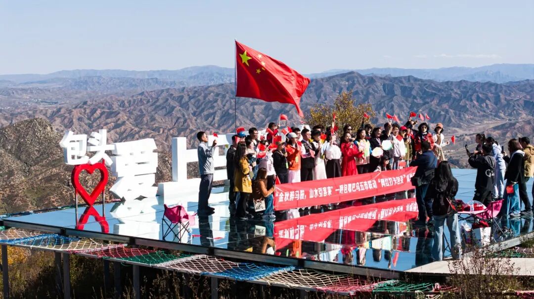 在包头市固阳县马鞍岭,山顶上的五星红旗迎风飘扬。