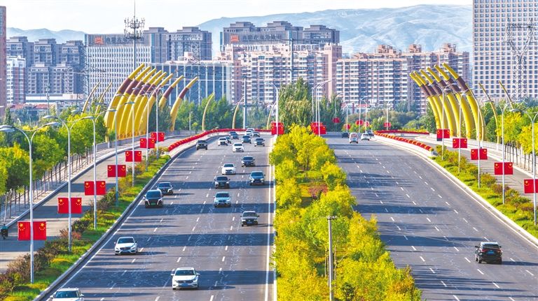 9月30日,数百面国旗悬挂在呼和浩特市丝绸之路大道上。为营造浓厚的国庆节日氛围,呼和浩特市在重点路段、商区及单位规范悬挂国旗,一抹抹鲜艳的“中国红”形成了一道道亮丽的风景线。草原云·内蒙古新闻网记者 怀特乌勒斯 摄