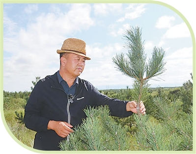 内蒙古通辽市科尔沁左翼后旗“双百万亩”项目区,朝克吐正在查看樟子松嫁接红松的长势情况。冯新蕾 摄