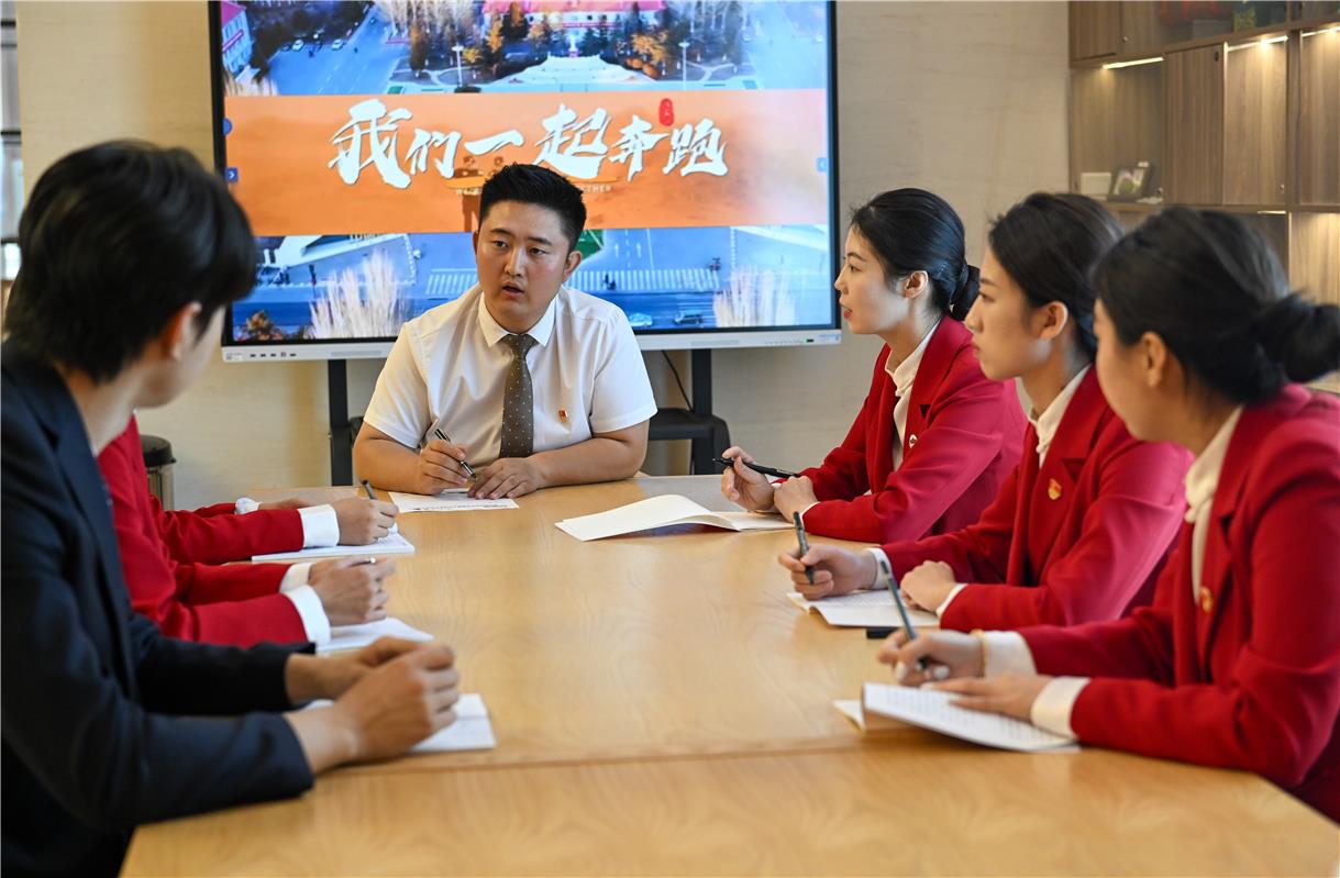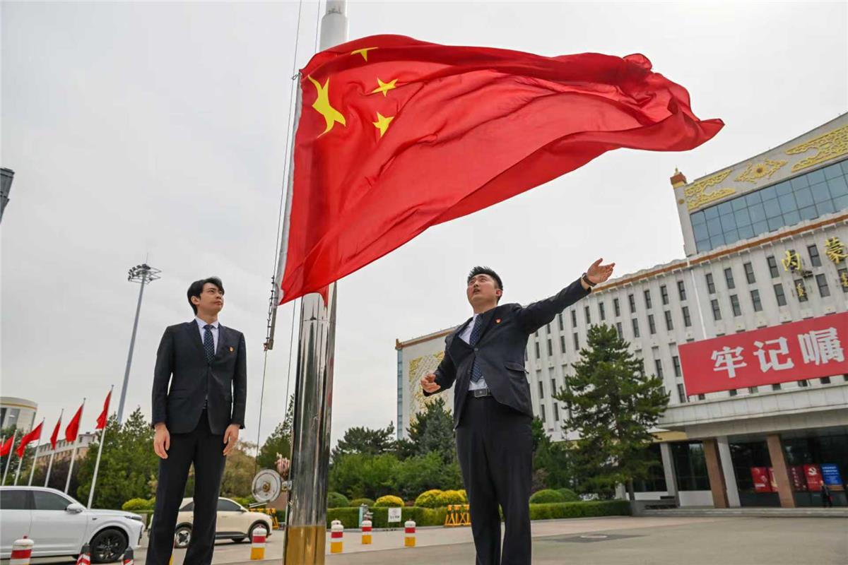 9月28日清晨,内蒙古展览馆广场上,金雪剑与同事们整齐列队,注视着五星红旗在朝阳中冉冉升起。这面迎风飘扬的国旗,见证了他从青涩志愿者到金牌讲解员的8年成长。