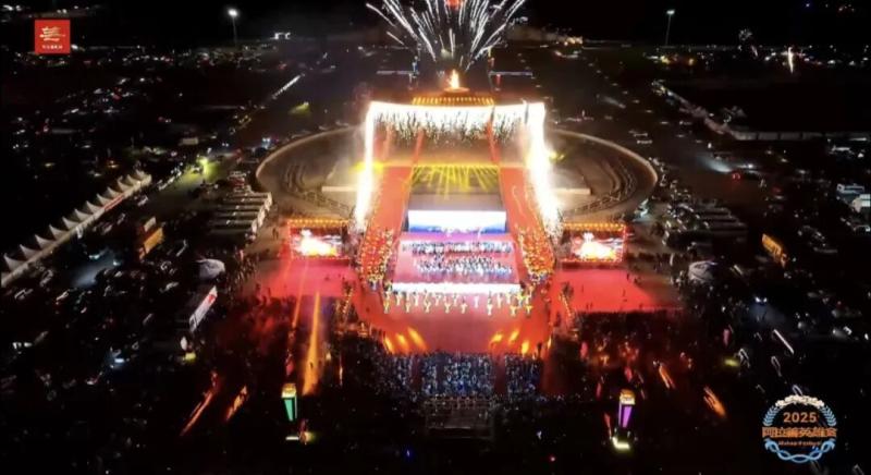 10月1日晚,腾格里沙漠腹地星光璀璨、引擎轰鸣,2025阿拉善英雄会开幕式在梦想沙漠公园盛大启幕。来自世界各地的越野爱好者、嘉宾与游客齐聚一堂,在歌舞表演与欢呼声中,在万车齐鸣与灯光交映中,共同开启一场集赛事、文化、科技于一体的越野嘉年华。