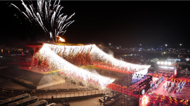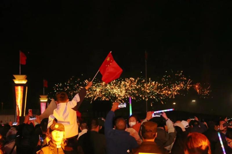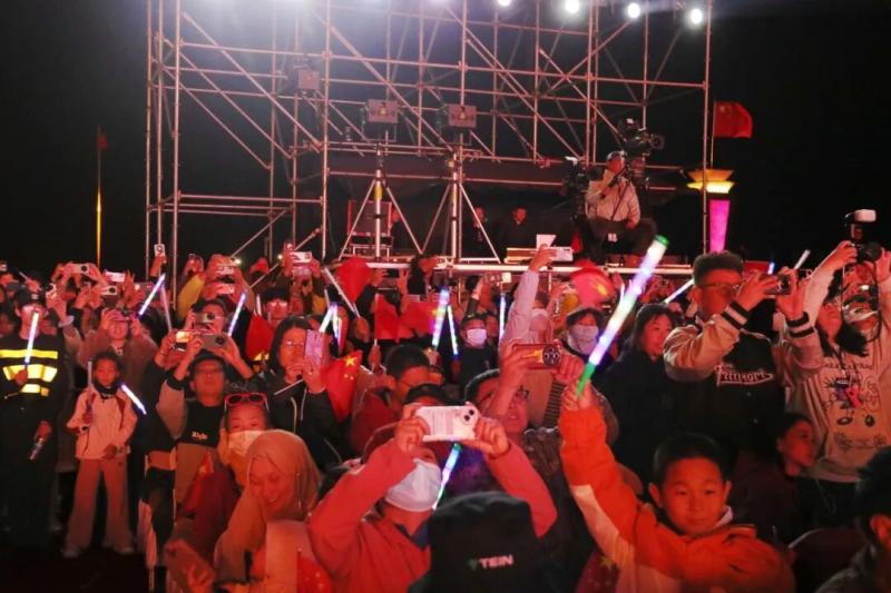 圣火照亮沙海,礼花声、呐喊声响彻夜空,当全场嘉宾共同唱响《歌唱祖国》,一种深沉而温暖的力量在每个人心中激荡,这歌声是穿越沙海的暖流,更是祝福伟大祖国繁荣富强的澎湃心声。