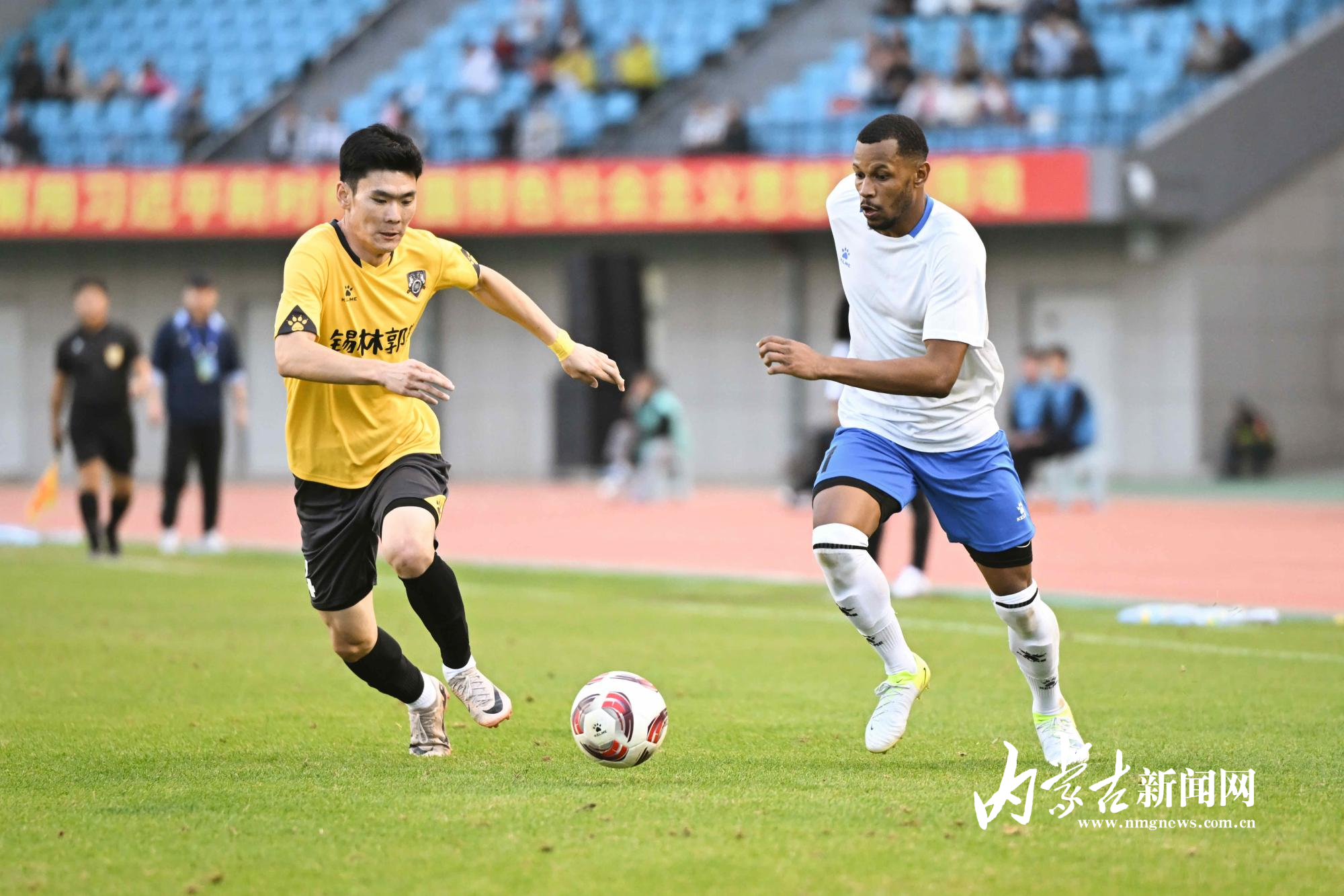 比赛伊始,双方迅速进入状态,中场拼抢异常激烈,现场球迷助威声震耳欲聋,气氛瞬间拉满。僵局在第15分钟被打破。锡林郭勒队左路突破后送出精准传中,呼和浩特队防守球员头球解围不远,被锡林郭勒队10号队员忠尼勒敏锐捕捉,果断停球起脚射门,皮球应声入网,客队率先取得领先。