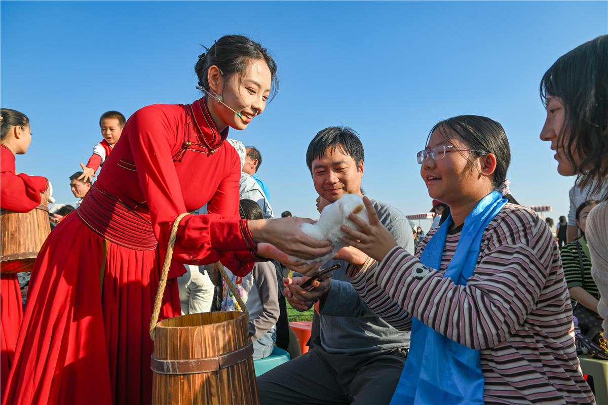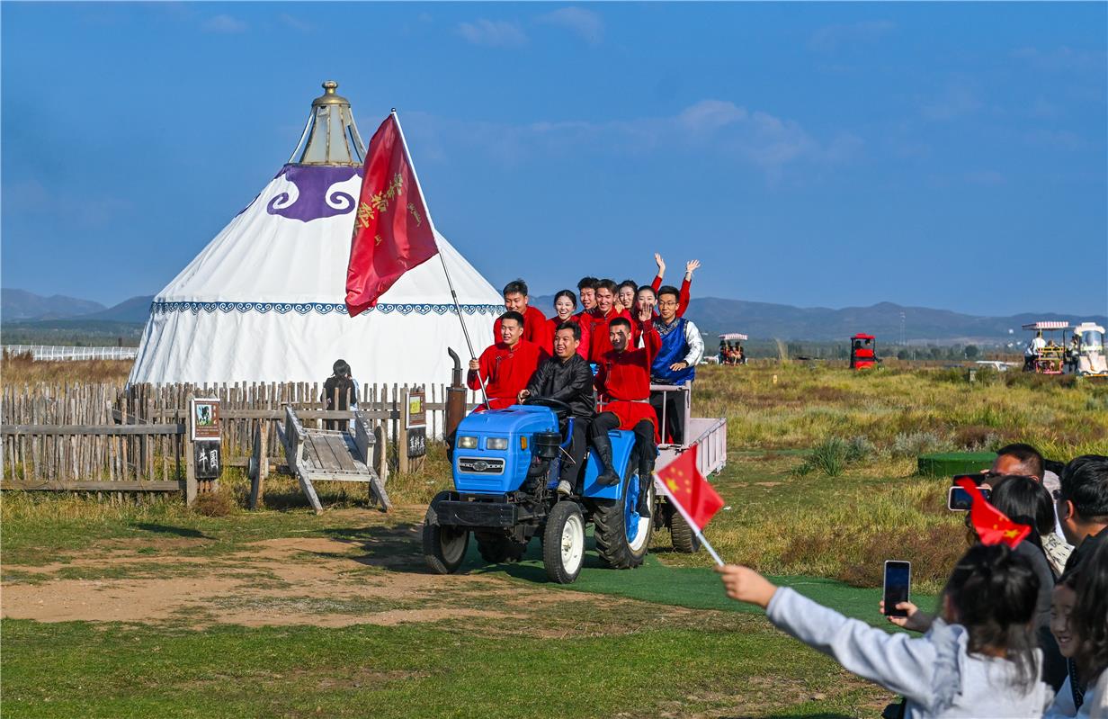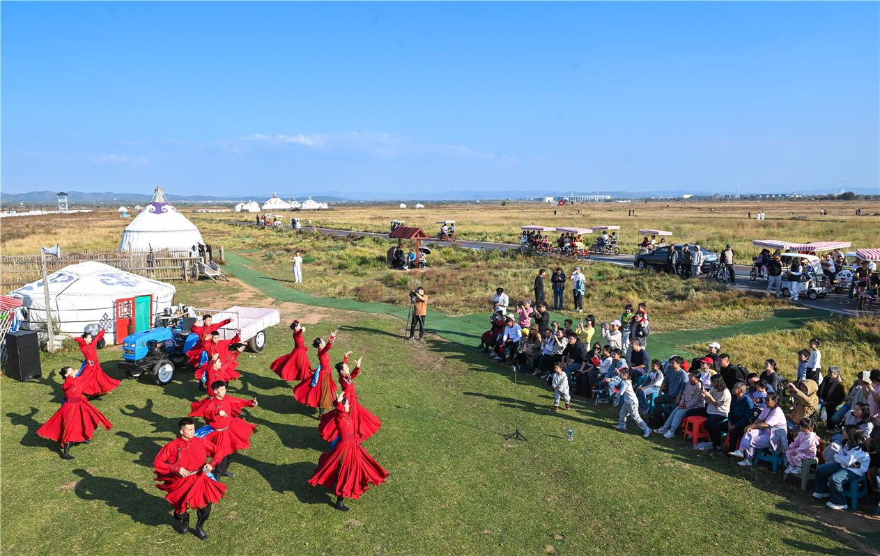 10月3日,呼和浩特市乌兰牧骑原创实景演艺剧目“欢腾的敕勒川”在敕勒川草原精彩上演。该剧结合呼麦、马头琴、长调、民族歌舞等多种艺术形式进行情境式表演,演出场景与敕勒川草原融为一体,实地布置蒙古包、勒勒车、草原拖拉机等生活化场景,融入献哈达、邀观众共舞等互动环节,给观众带来沉浸式视听享受。