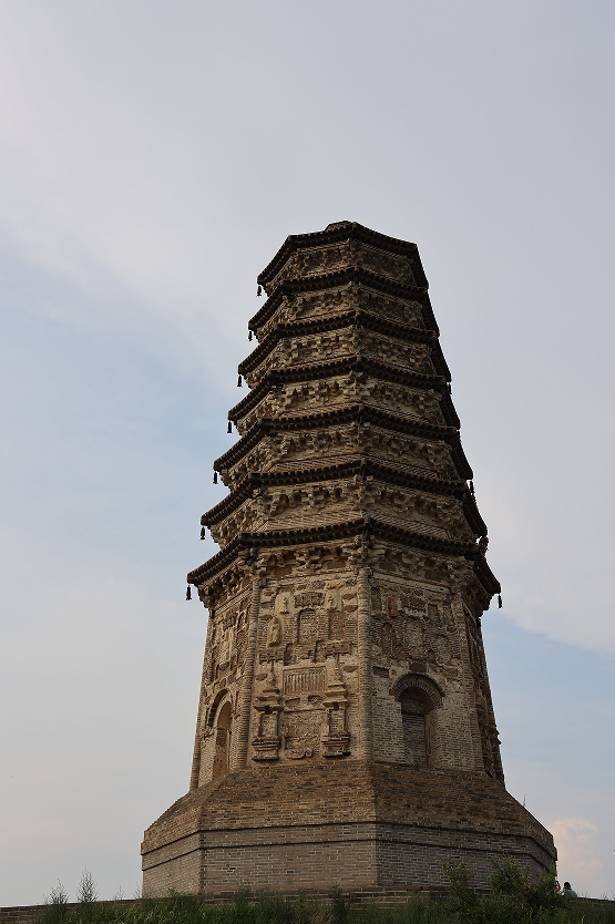 你在接近它,它也在接近你。走近这座辽塔,一千年的时光恍在眼前。绕着塔身细细观赏,这座高近26米的砖筑八角七层密檐塔,塔身各面嵌有赭色石质和砖质浮雕,有佛、飞天、菩萨、道士、小塔等。不过塔上现存浮雕都为复制品,塔身原镶嵌84件石刻浮雕,现多已剥落。1991年维修时,将残存的21件石刻揭取,存放于辽上京博物馆。这些石刻是目前最为珍贵的辽代佛教石刻艺术品之一。