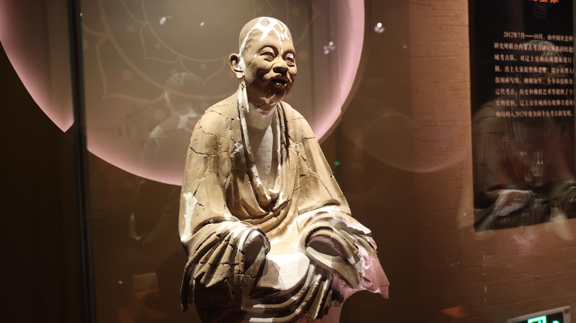 “除了南塔上的石雕,来到我们博物馆还一定要看2012年辽上京考古队从西山坡佛寺遗址发掘的一批辽代彩绘泥塑罗汉像。”辽上京博物馆讲解员吴迪指着一组独立展柜的泥塑像介绍道,“你看这些罗汉塑像是模仿真人形象,具有世俗的审美取向。它们以高度写实主义风格突破了传统佛教造像程式化桎梏,印证了辽金时期佛教艺术的世俗化转向与民族融合特质,为研究辽代艺术史和宗教史提供了重要的实物资料。”