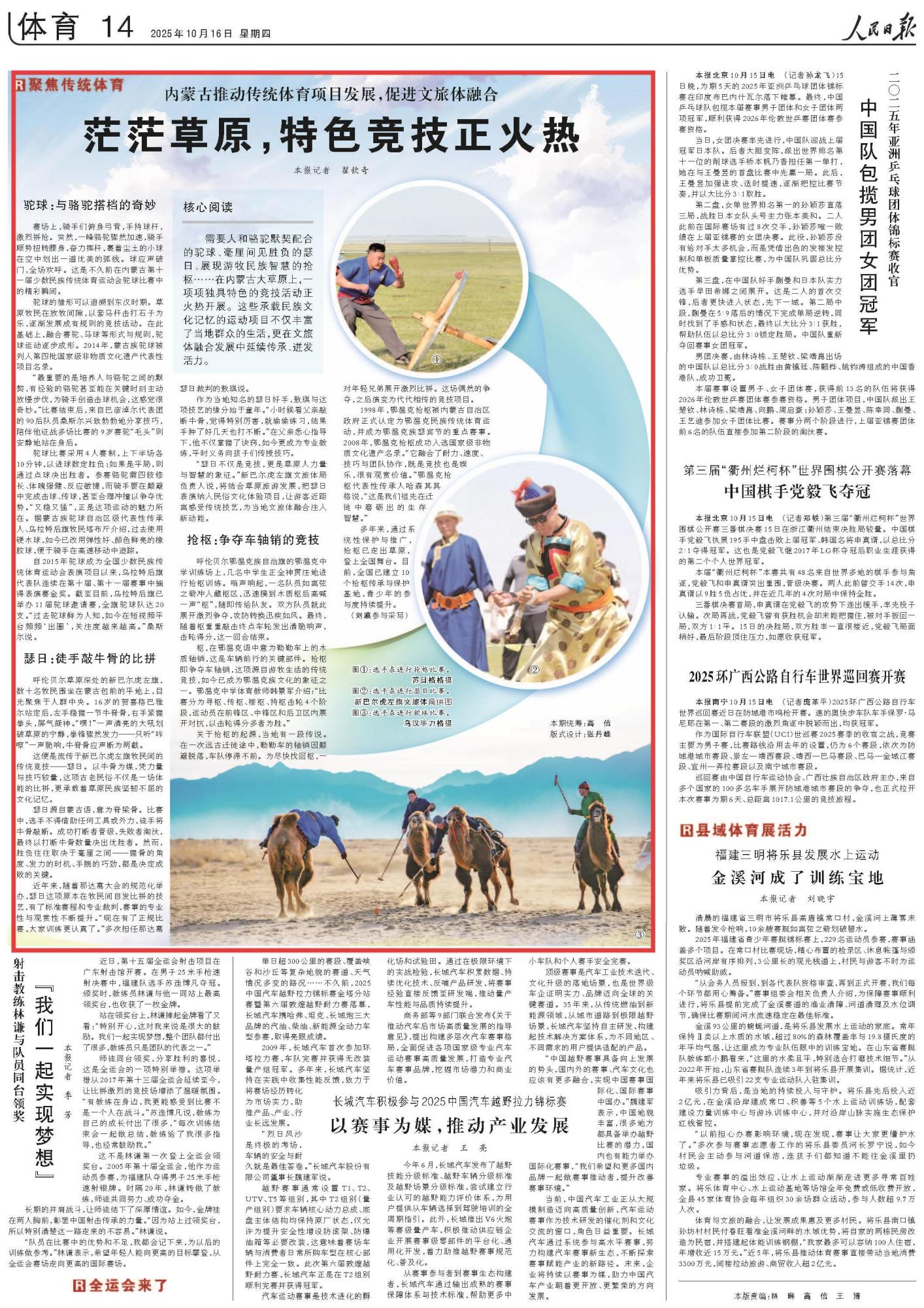 2025年10月16日,《人民日报》第14版刊发题为《茫茫草原,特色竞技正火热》的文章,报道了内蒙古大草原上,一项项独具特色的竞技活动正火热开展。这些承载民族文化记忆的运动项目不仅丰富了当地群众的生活,更在文旅体融合发展中延续传承、迸发活力。
