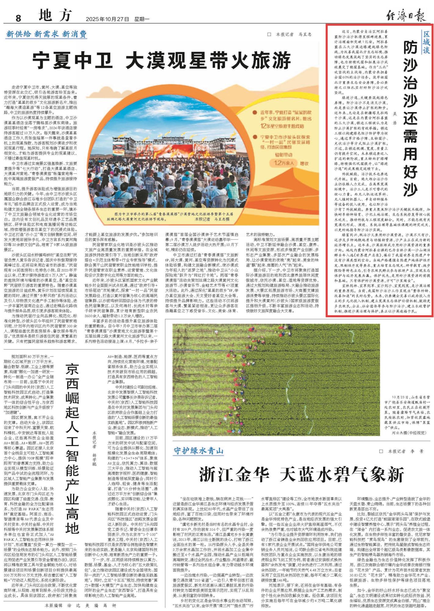 2025年10月27日,《经济日报》第8版刊发题为《防沙治沙还需用好沙》的文章,报道了内蒙古阿拉善盟防沙治沙累计治理面积突破1亿亩。阿拉善盟在三大沙漠边缘建起绿色防线,为持续巩固和拓展治沙成效奠定了稳固基础。内蒙古承担着全国60%的治沙任务。须持之以恒打好防沙治沙攻坚战。