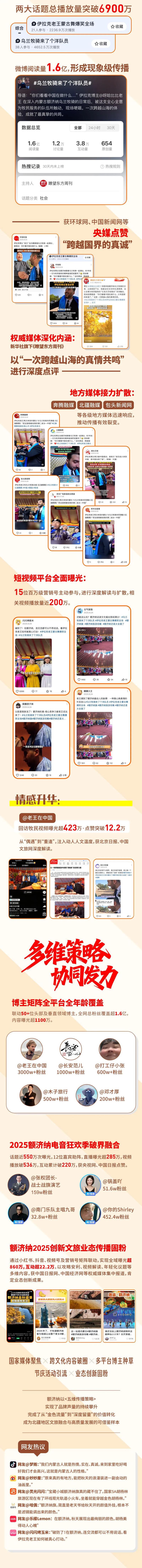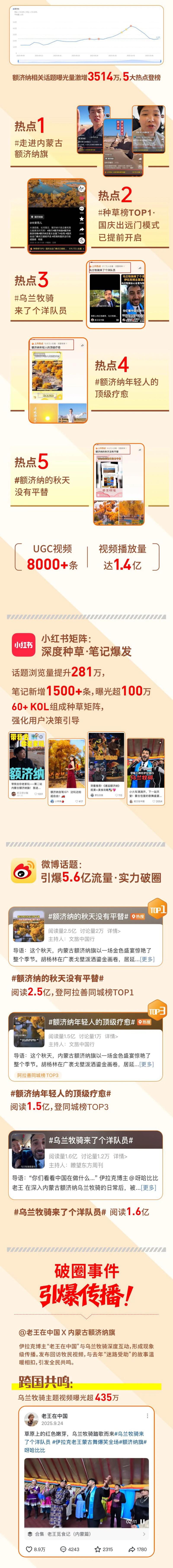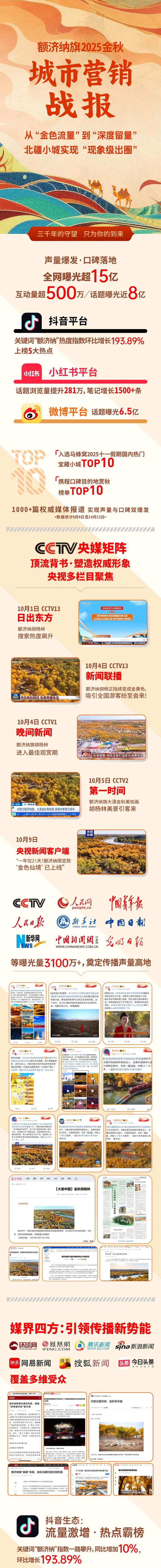 央媒高频聚焦、三大特色文旅项目惊艳亮相、跨文化博主“老王在中国”的温暖互动、电音狂欢与文旅业态创新……这个秋天,额济纳旗以“特色文旅项目+跨文化内容破圈+多平台博主种草+节庆活动引流+业态创新固粉”策略,让“金秋额济纳”成为无数人心中的“诗意远方”。