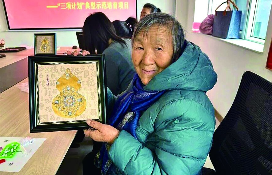 不一会,一幅幅兼具宋锦古韵与珍珠光泽的作品接连完成。居民们捧着自己的成果相互展示、合影,成就感溢于言表。“你看我这幅作品的主题是民族团结,用不同颜色珍珠代表各民族,寓意真好!”现场赞叹声、笑声不绝。