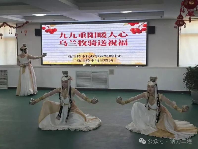 随后,二连浩特市乌兰牧骑队员身着亮丽服饰登场,带来一场充满温情的文艺表演。演出涵盖经典歌曲、民族舞蹈等多种形式,节目内容贴合老年人审美与情感需求,或传递对美好生活的赞颂,或表达对长辈的诚挚祝福,轻松欢快的旋律与生动鲜活的演绎,让现场不断响起掌声与笑声。