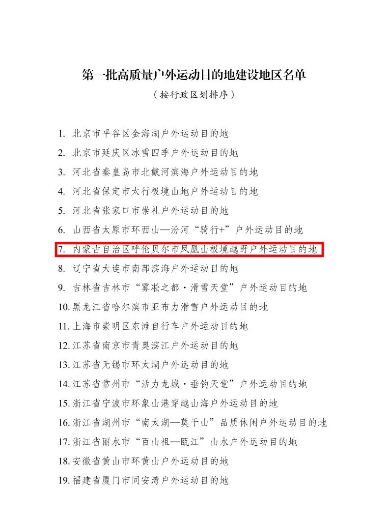 近日,国家发展改革委等6部门印发通知(发改办社会〔2025〕908号)联合公布第一批高质量户外运动目的地建设地区名单,拟将49个目的地纳入高质量户外运动目的地建设地区名单予以重点支持,呼伦贝尔市凤凰山极境越野户外运动目的地成功入选,成为内蒙古自治区此次唯一入选的户外运动目的地。