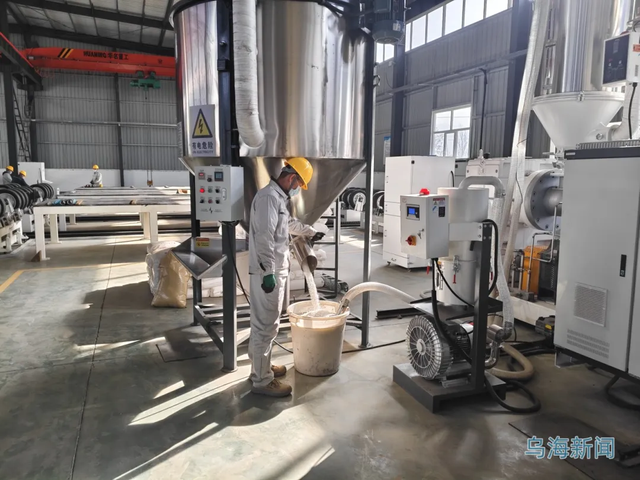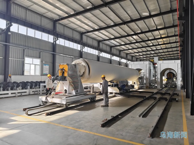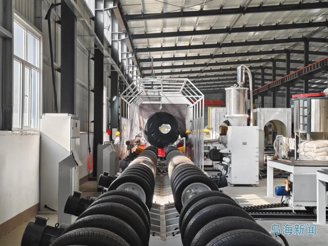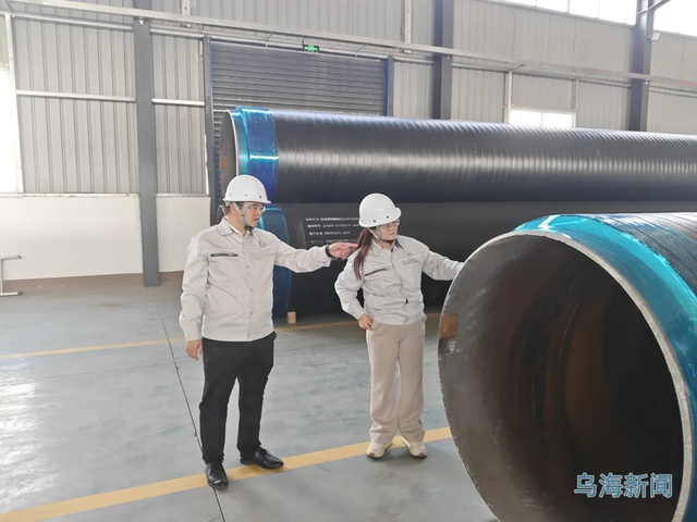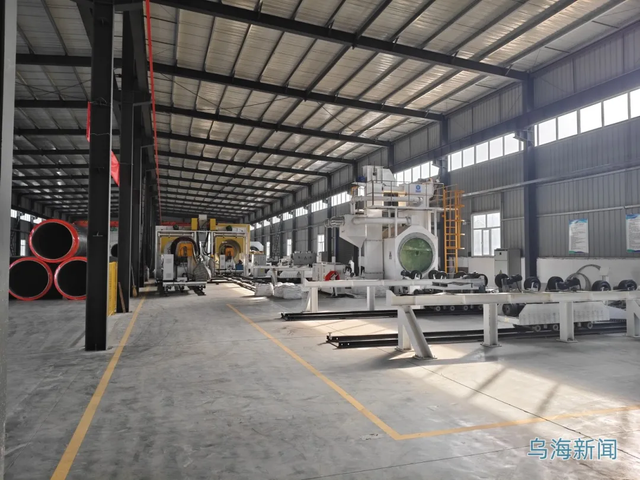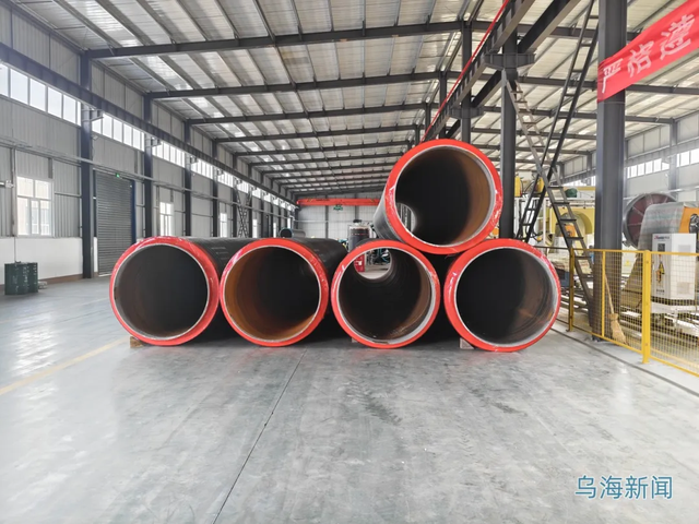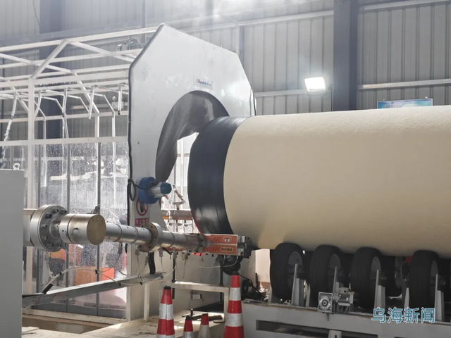 10月29日上午,在乌海海勃湾高新技术产业开发区的中润新德新材料(内蒙古)有限公司,走进超组装供热智能成品管道生产车间,生产线上,设备正在对保温管进行聚乙烯缠绕。经过除锈、喷涂、缠绕等工序后,一节超组装供热智能成品管道就被制作出来。