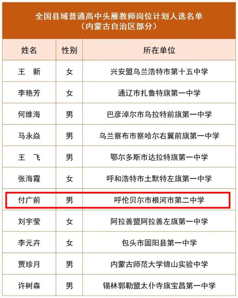 近日,教育部办公厅印发《关于公布全国县域普通高中头雁教师岗位计划人选的通知》,确定首批全国县域普通高中头雁教师岗位计划入选教师名单,其中呼伦贝尔市1人入选,一起来看名单——