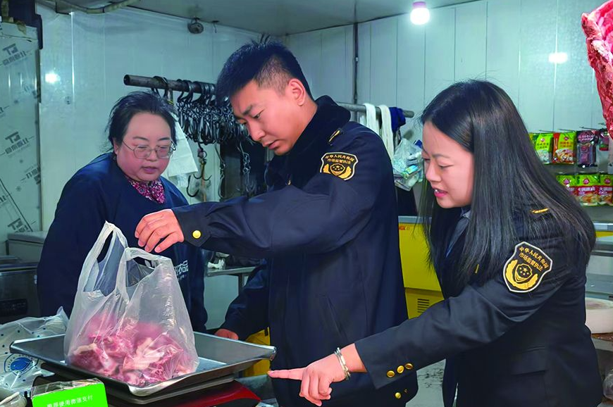 执法人员检测羊肉摊电子计价秤 鲍娜 摄