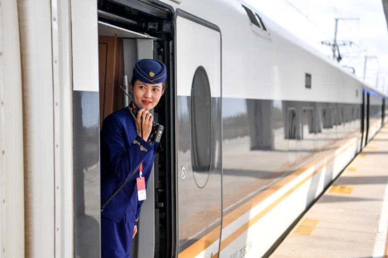 11月6日,国铁呼和浩特局包头客运段列车长杨静雯进行包银高铁试验车发车前瞭望。