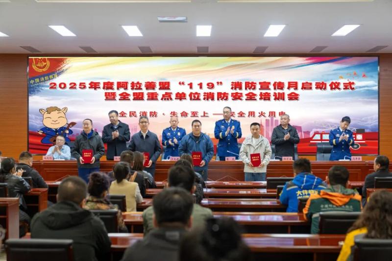 宣传月活动启动仪式上,阿拉善盟消防救援支队对2025年度消防工作先进集体和先进个人进行了表彰,向消防宣传公益使者颁发了聘书,并开展了消防安全培训。