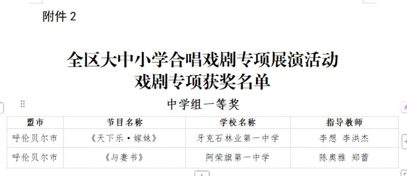 近日,内蒙古自治区大中小学合唱专项展演在鄂尔多斯大剧院圆满落幕。呼伦贝尔市三所学校在“2025年内蒙古自治区大中小学合唱戏剧专项展演活动”中大放异彩,一举斩获中学组班级合唱一等奖、中学组戏剧专项一等奖、最佳指挥奖、最佳伴奏奖、最佳导演奖五项奖项,师生们的精湛演绎赢得自治区级专业认可,彰显呼伦贝尔市学校美育教育的丰硕成果与硬核实力。