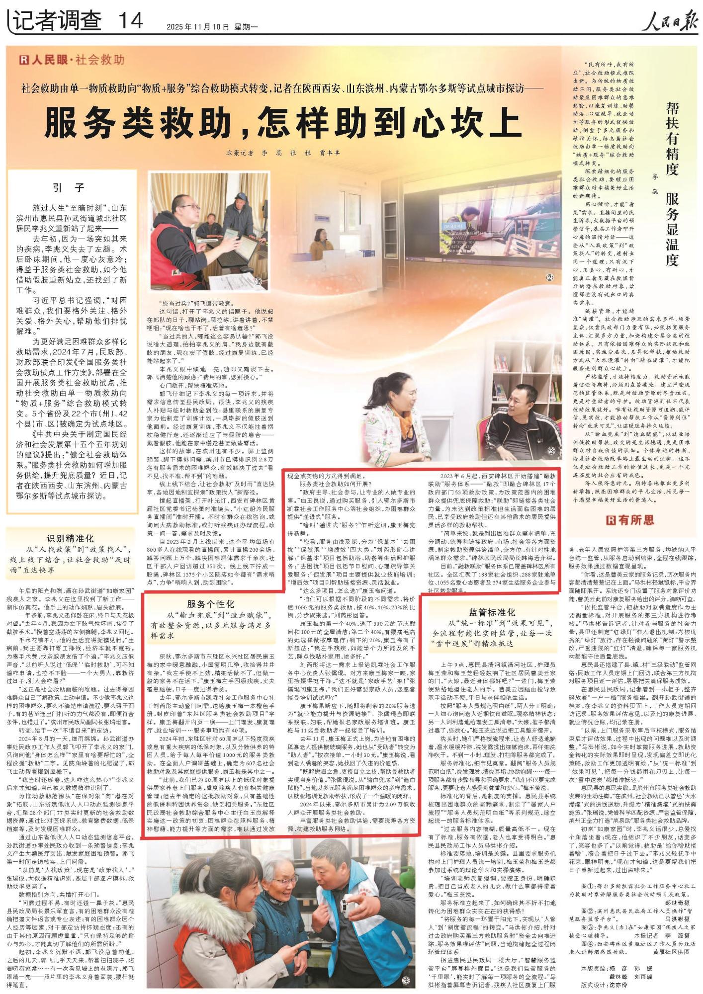 2025年11月10日,《人民日报》第14版刊发题为《服务类救助,怎样助到心坎上》的文章,报道了鄂尔多斯市东胜区推行服务类社会救助,为困难群众提供生活照料、心理疏导及就业培训等递进式服务。通过政府购买服务,帮助受助者掌握技能并实现就业,从“输血兜底”转向“造血赋能”,以多元服务满足多样需求。