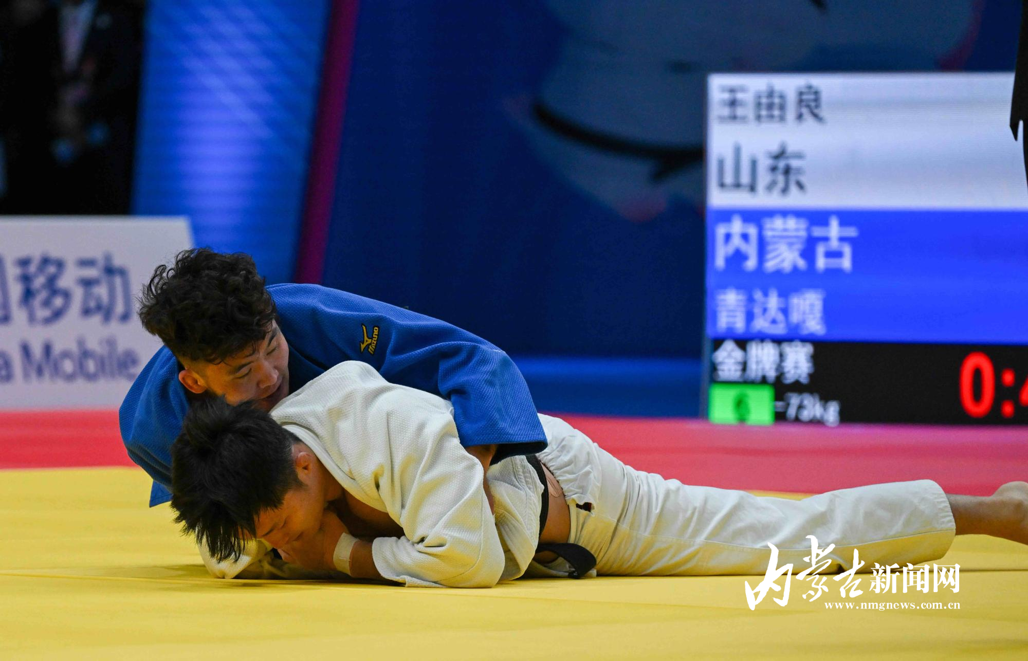 当日的比赛在内蒙古选手青达嘎与山东队的王由良之间展开。比赛伊始,青达嘎展现了绝对实力,在比赛中以强大的压迫力掌控节奏,率先得到一个技有,掌握了场上的主动权,在距离比赛结束还有10多秒时,青达嘎更是抓住机会以一记无可挑剔的投技,将对手精准地摔落在垫上,动作干净利落,青达嘎以柔道中最完美的一本赢得了胜利,夺得金牌。