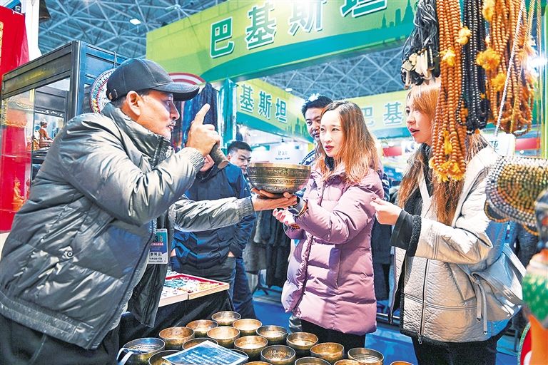 11月12日,顾客在尼泊尔展位挑选商品。当日,为期6天的第十三届中国·内蒙古进出口商品博览会在内蒙古国际会展中心开展。博览会以“创新商务模式、提升国际化水平”为核心,设置展位300余个,来自法国、巴基斯坦、俄罗斯等20余个国家的企业参展,汇聚特色食品、工艺品、化妆品等数千种商品。草原云·正北方网记者 王磊 摄