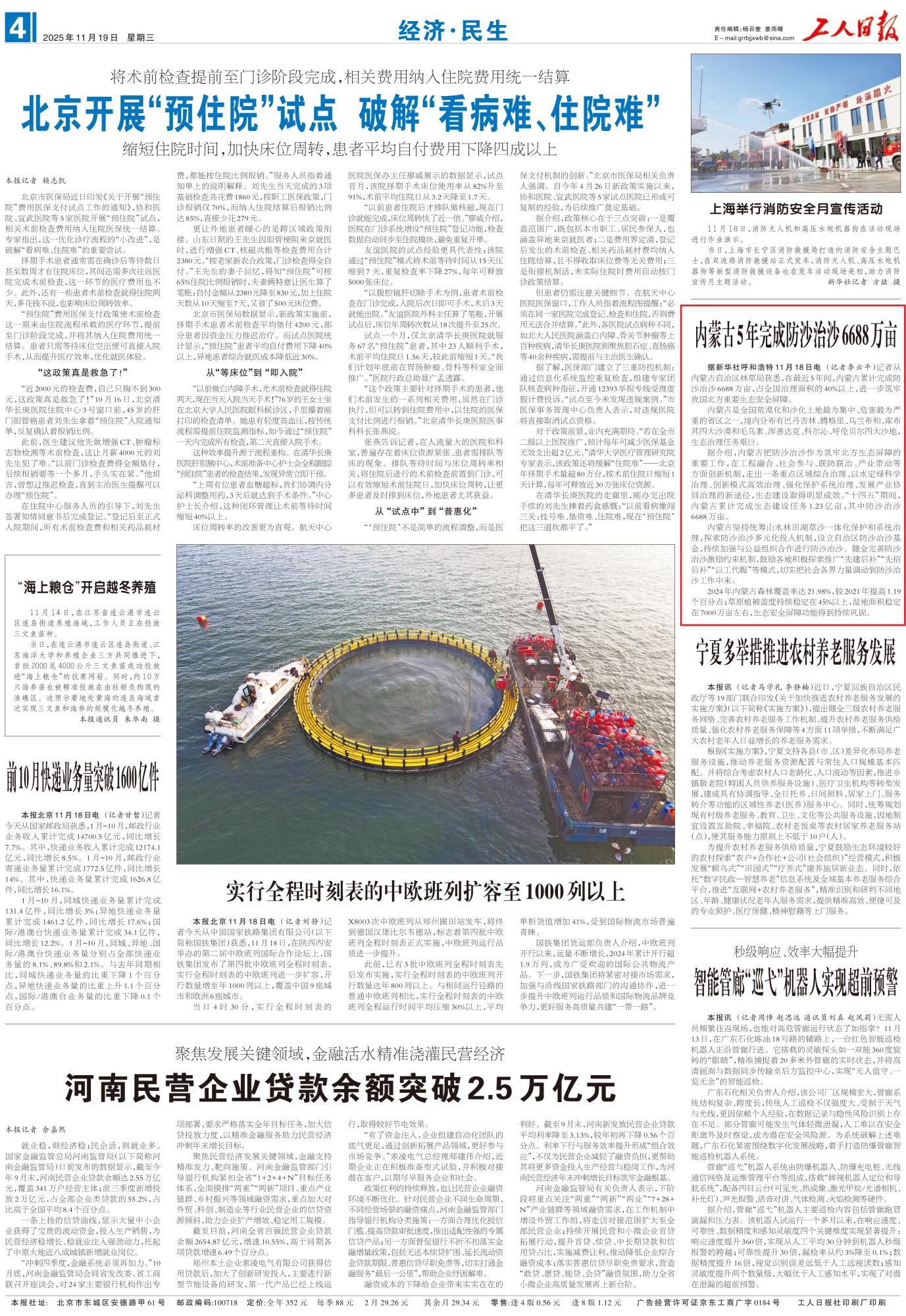 2025年11月19日,《工人日报》第4版刊发题为《内蒙古5年完成防沙治沙6688万亩》的文章,报道了在最近5年间,内蒙古累计完成防沙治沙6688万亩,占全国治理面积的40%以上,进一步筑牢我国北方重要生态安全屏障。
