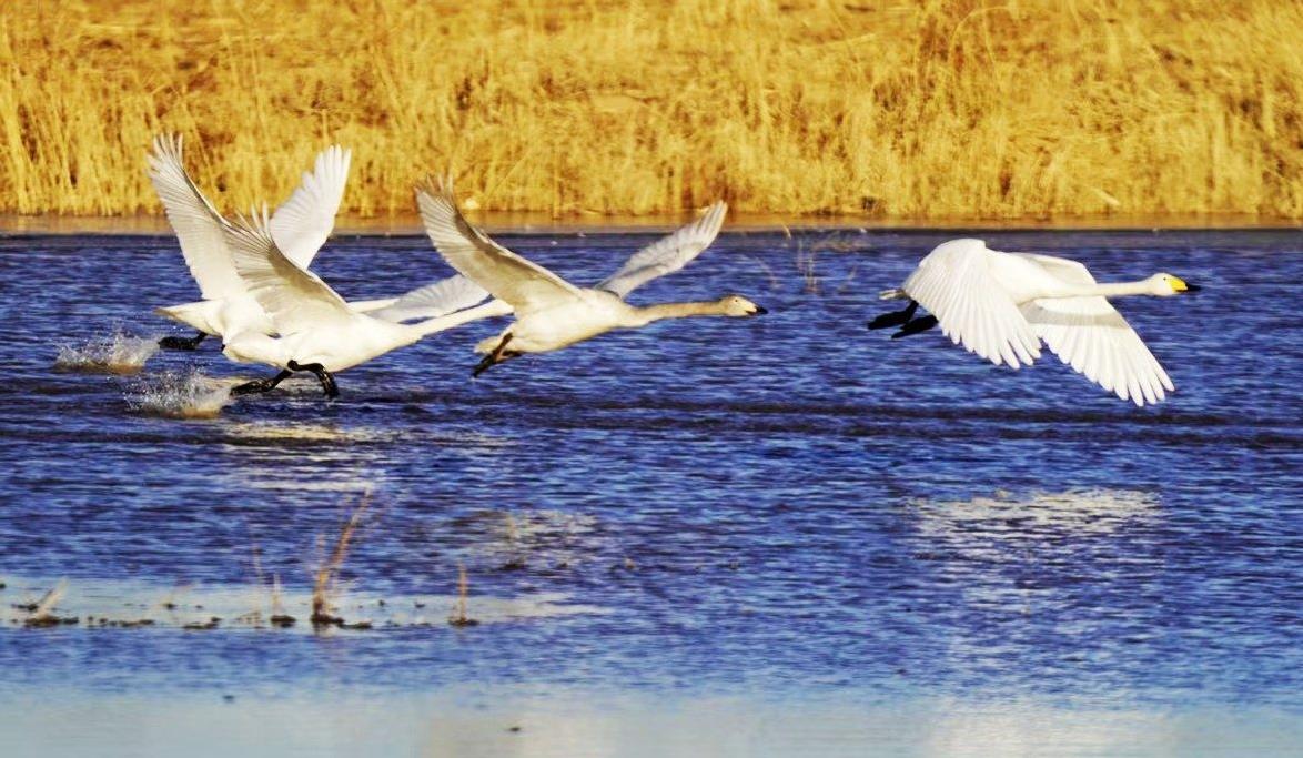 生态的蝶变,鸟类是直接的“见证者”。磴口县100多处湖泊湿地为鸟类提供了充足的食源,每年吸引成群鸟类在此停留歇息,包括苍鹭、大天鹅、疣鼻天鹅等多种国家保护鸟类和珍稀鸟类。从春秋迁徙季的天鹅翔集,到深秋的白鹭群舞,再到银鸥、苍鹭等鸟类的常态化栖息,磴口县“鸟类乐园”的图景日渐丰盈。