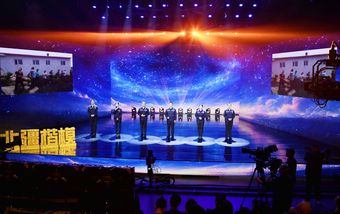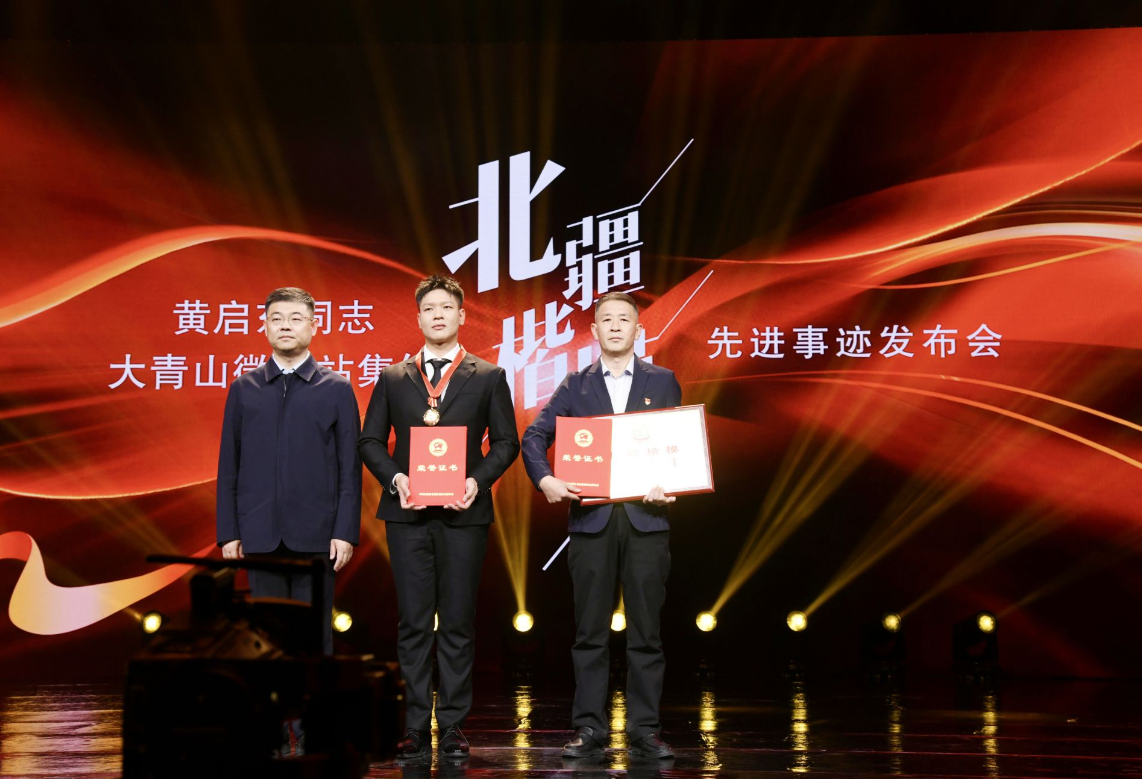 为黄启东同志和大青山微波站集体颁发“北疆楷模”证书和奖章。