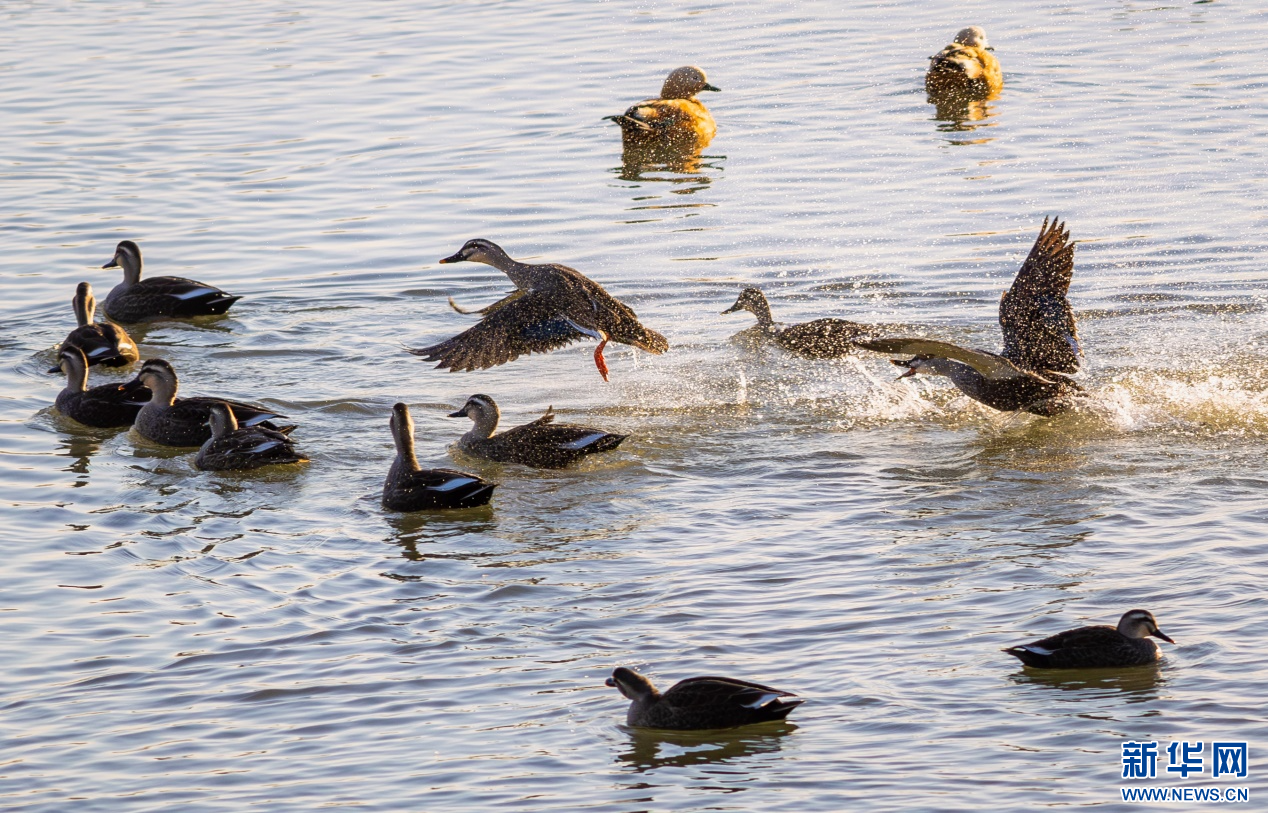 11月19日,斑嘴鸭在呼和浩特市玉泉区“千岛湖”景区的水面上嬉戏、觅食。新华网发(丁根厚 摄)