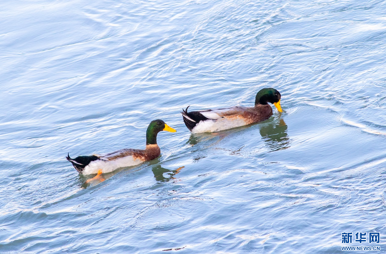 11月19日,绿头鸭在呼和浩特市玉泉区“千岛湖”景区的水面上栖息、觅食。新华网发(丁根厚 摄)