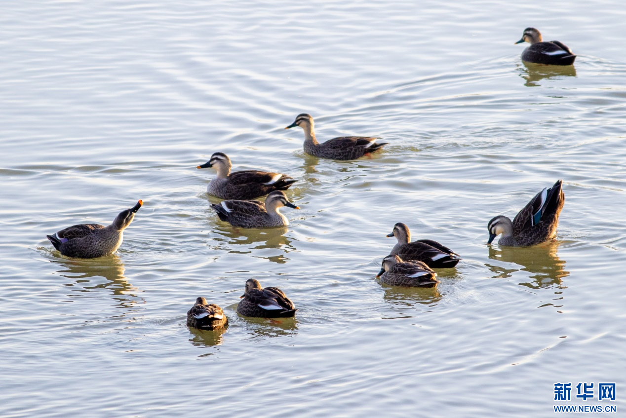 11月19日,斑嘴鸭在呼和浩特市玉泉区“千岛湖”景区的水面上栖息、觅食。新华网发(丁根厚 摄)