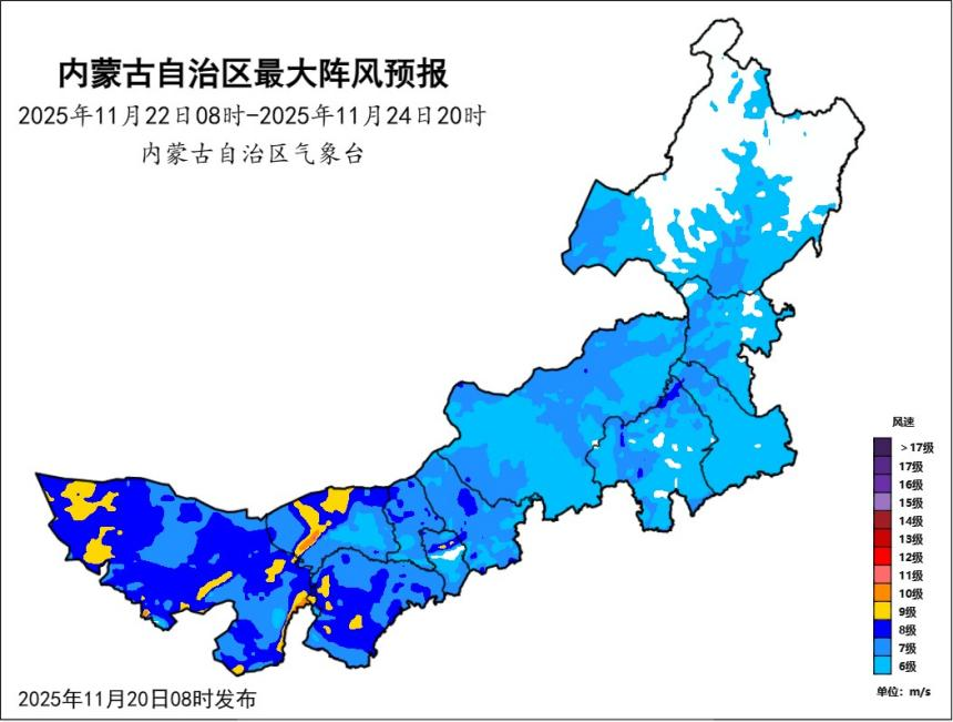 11月22日08时至24日20时,我区大部地区4、5级短时6、7级西北风或偏西风,其中,阿拉善盟大部、巴彦淖尔市西部和北部、乌海市、鄂尔多斯市中西部、包头市西北部、呼和浩特市北部、乌兰察布市北部阵风可达8、9级,西部偏西局地伴有沙尘天气。