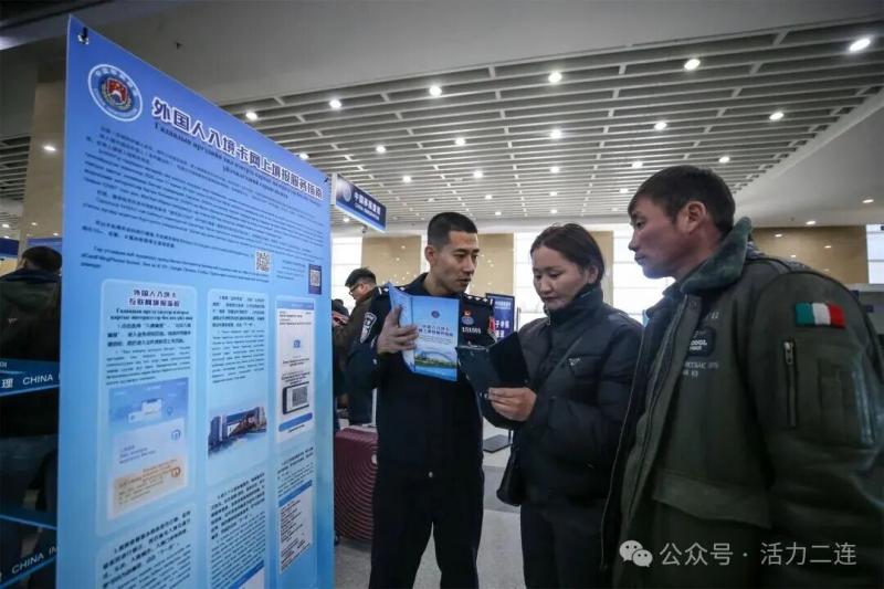 2025年11月20日,二连出入境边防检查站移民管理警察为旅客讲解外国人入境卡网上填报流程