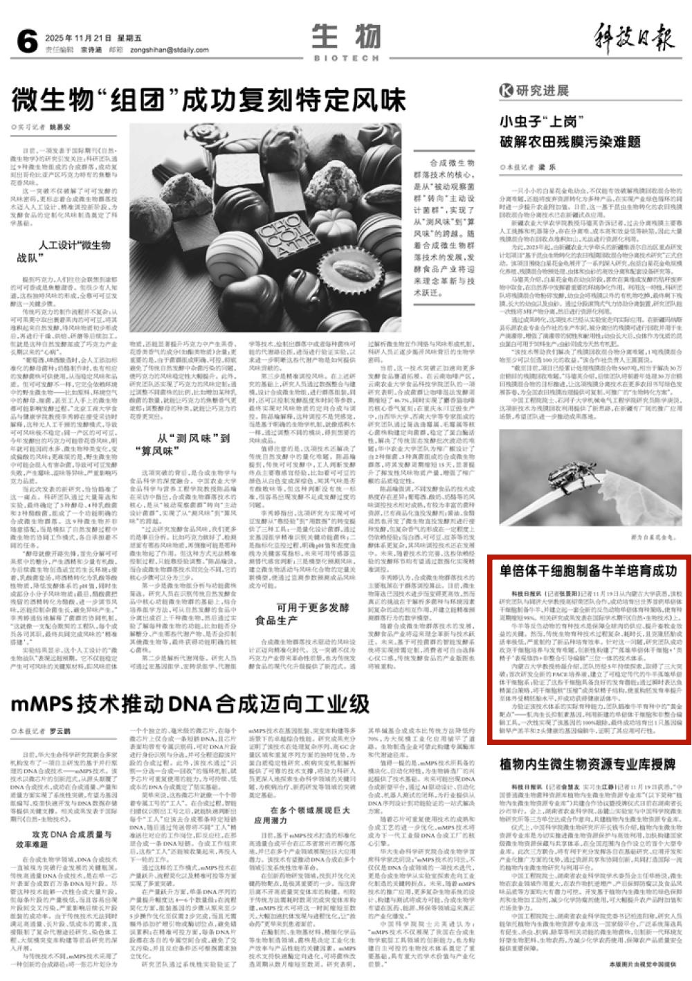 2025年11月22日《科技日报》第6版刊发了《单倍体干细胞制备牛羊培育成功》的文章,报道了内蒙古大学获悉研究团队与同济大学教授高绍荣团队合作,成功培育出世界首例单倍体干细胞制备牛羊,使育种周期缩短95%。