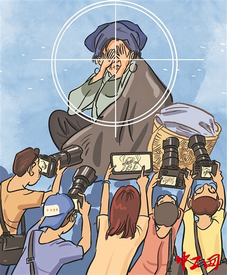游客一路走一路拍摄,从记录文化差异、感知人文地理风貌的角度看,拍摄特定着装的人物及其生活,通常并不算越界,前提是对方知情同意或者不拒绝。然而,很多时候,一些人在拍摄风土人情时似乎有“绑架”嫌疑,不顾对方意愿,“长枪短炮”直接上。从怼脸拍人物,到擅闯老建筑拍摄居民院子,再到“吃播”以其他顾客当“背景板”拍视频,此类以“记录”为名的越界行为涉嫌侵犯他人隐私权和安宁权。感知地域文化,快门怎么按、何时按,体现着拍摄者的态度和格局,以令人不适的方式获得的画面,并不美丽。(赵春青/图 嘉湖/文)