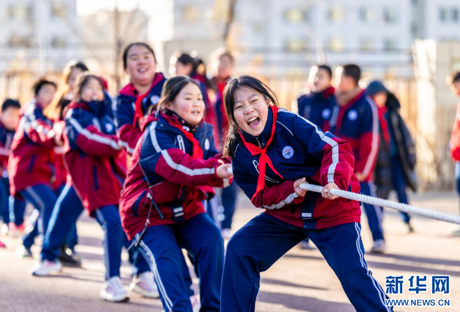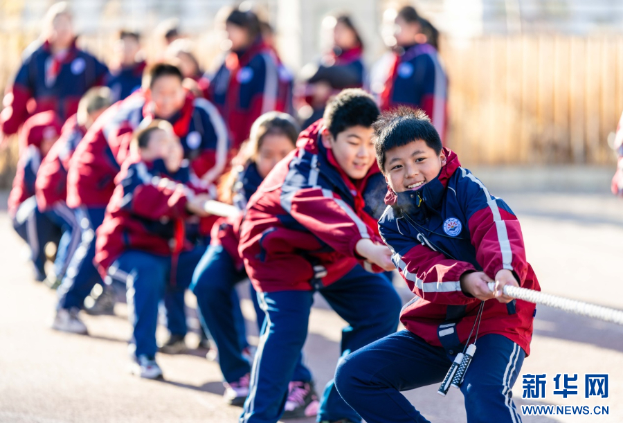 11月25日,内蒙古呼和浩特市玉泉区石东路小学的学生在操场上进行拔河比赛。新华网发(丁根厚 摄)