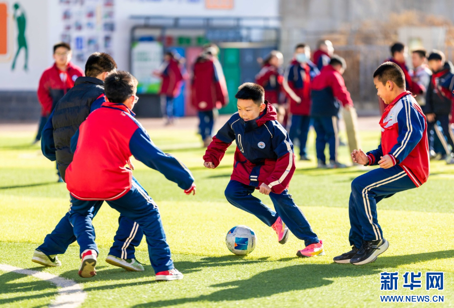 11月25日,内蒙古呼和浩特市玉泉区石东路小学的学生在操场上进行足球分组对抗赛。新华网发(丁根厚 摄)