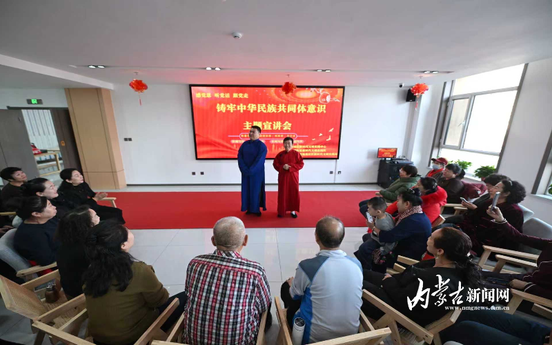 11月28日,“理论学习轻骑兵”、文艺工作者们用相声的表现方式进行理论宣讲。当日,呼和浩特市新城区东河街道举行铸牢中华民族共同体意识主题宣讲会,组织宣讲员队伍,将理论宣讲内容创作编排成相声、小品、诗朗诵等群众爱听爱看的文艺作品,采用文艺汇演+理论宣讲的形式,让基层群众听得懂、能领会、可落实。摄影/草原云·内蒙古新闻网首席记者 牛天甲
